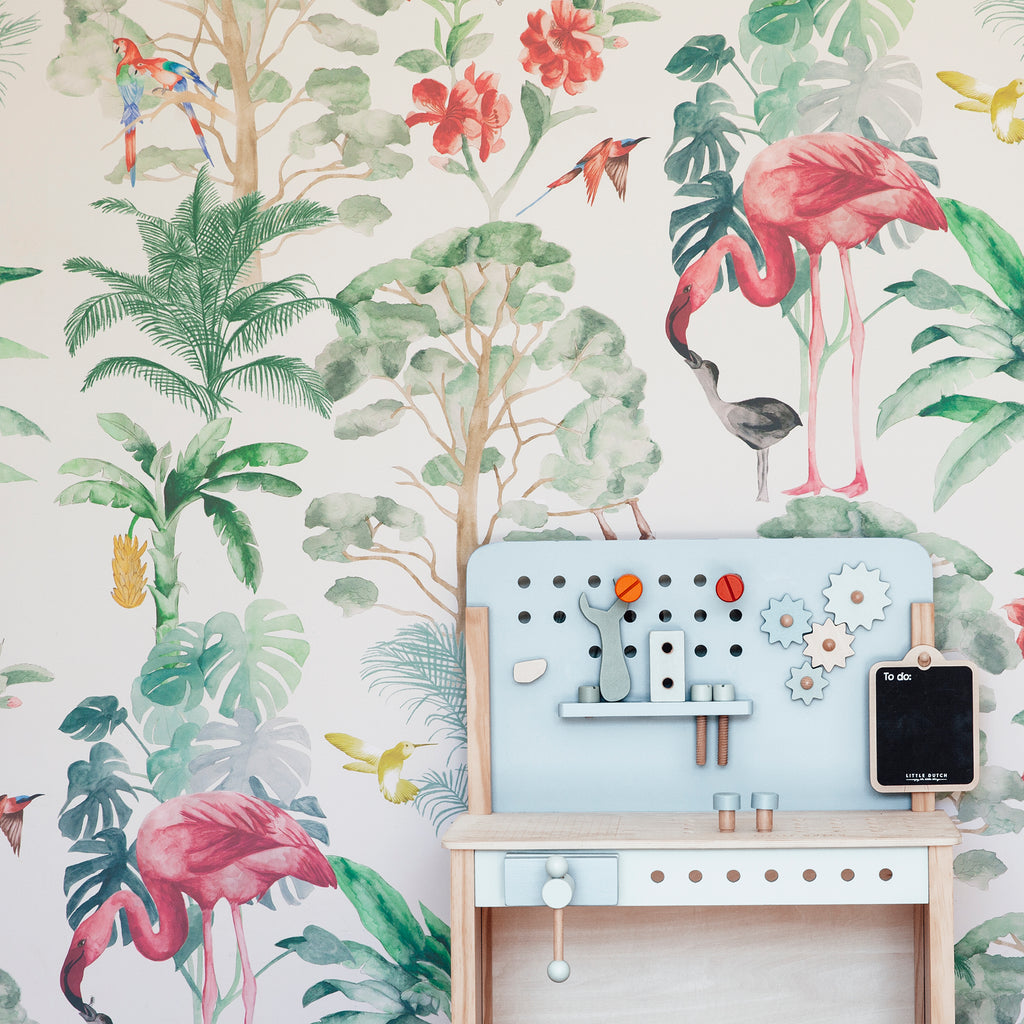 Transform your space into a tropical paradise with our Nova Tropical Wallpaper, a bold, large-scale design featuring hand-painted flamingos, exotic birds, and lush rainforest foliage. Created with vibrant rainforest greens and pops of jungle-inspired pinks and reds, this eye-catching wallpaper brings adventure and joy to any room. Ideal for children’s bedrooms, playrooms, dining rooms, and hallways, it’s perfect for those seeking a unique, statement-making interior.