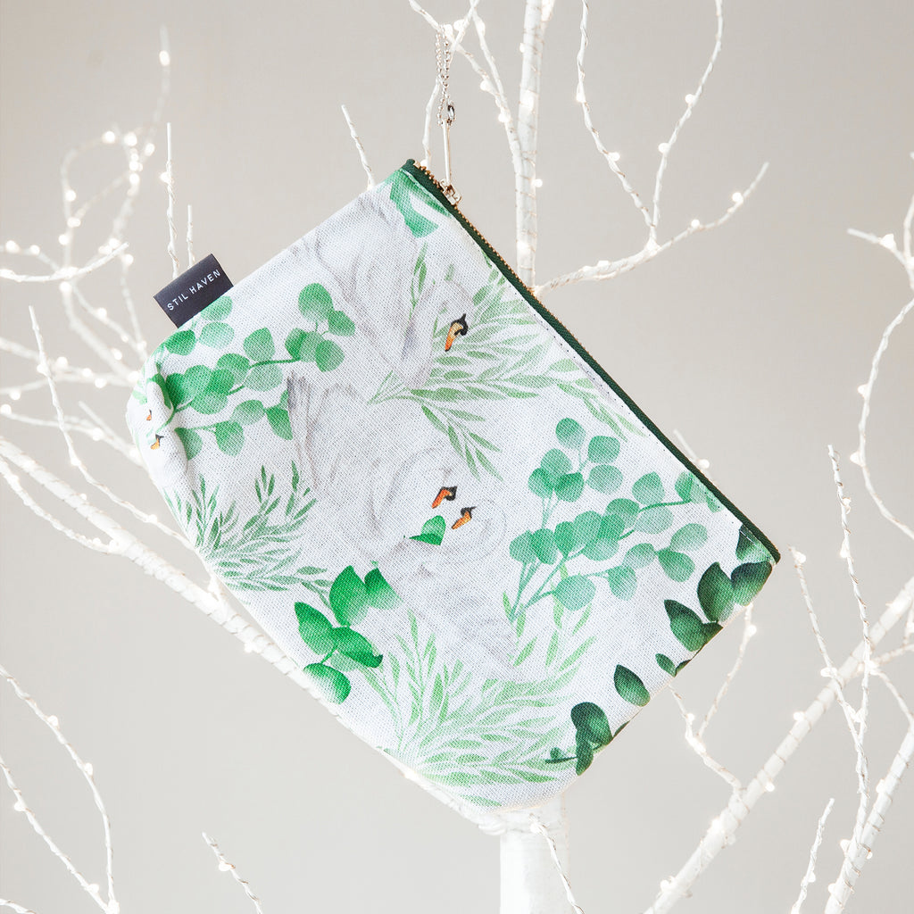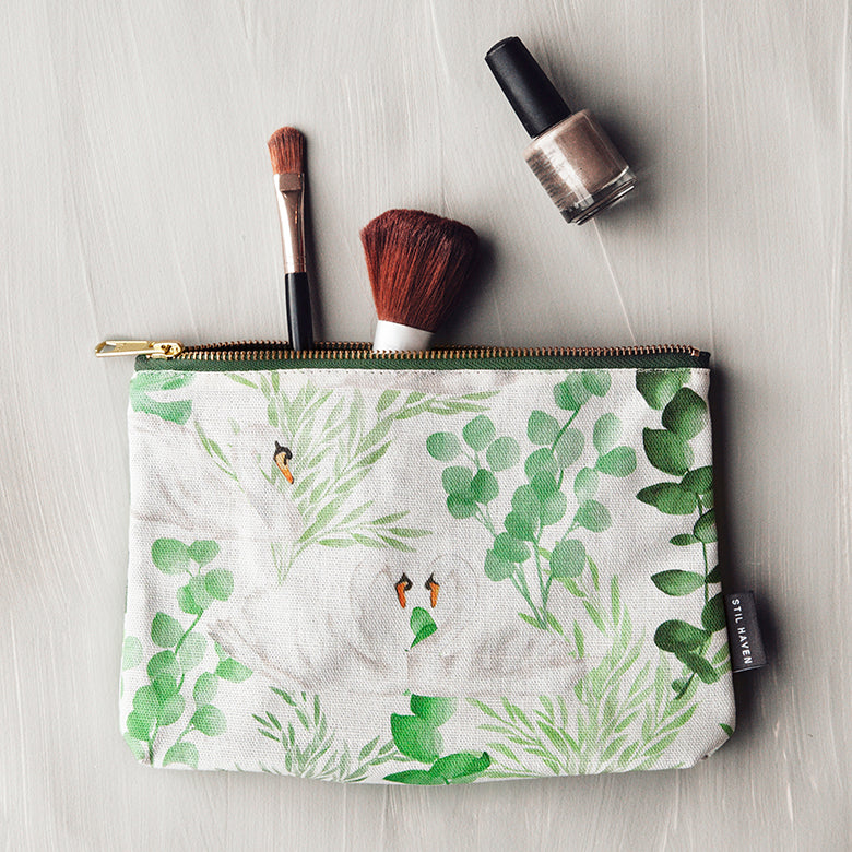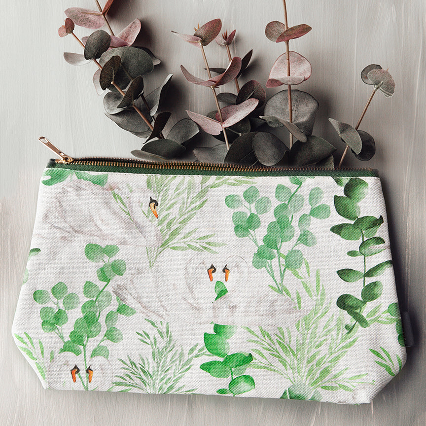 Bring elegance to your everyday essentials with our exclusive swan and lush greenery makeup bags, perfect for the modern, country-chic lifestyle. Hand-painted swans and rich botanical designs adorn these beautiful bags, crafted to be both stylish and functional. Available in medium and large sizes, these versatile bags are ideal for organizing cosmetics, baby essentials, or travel accessories.