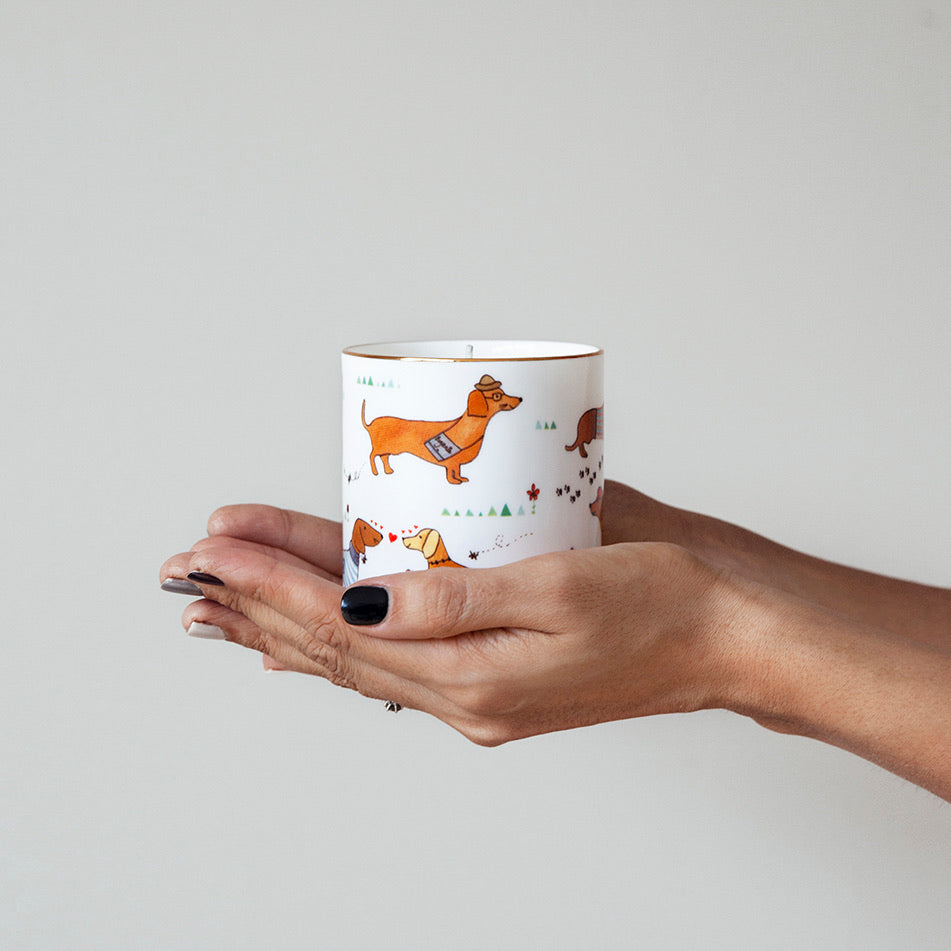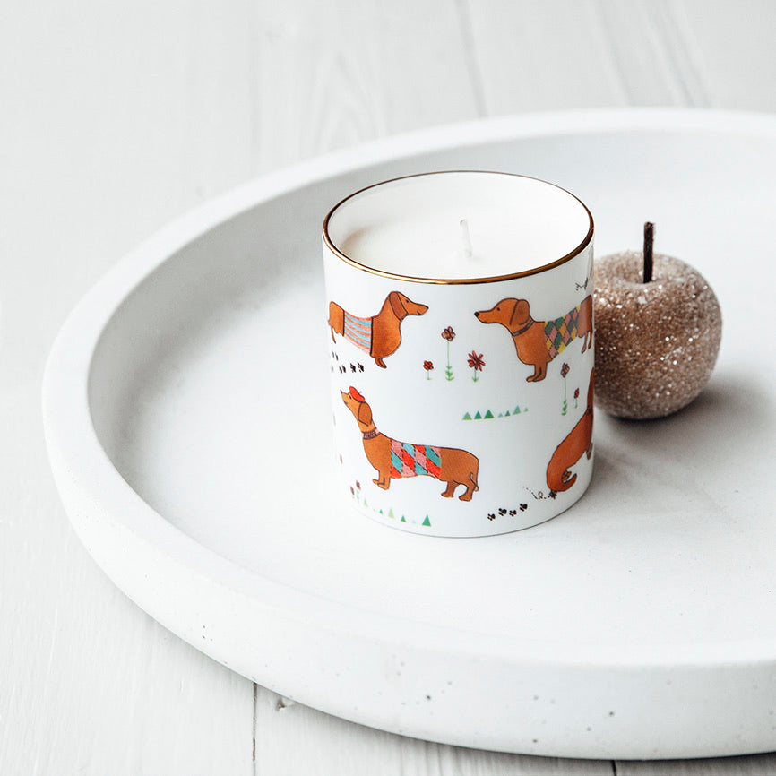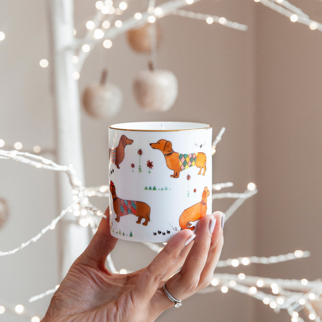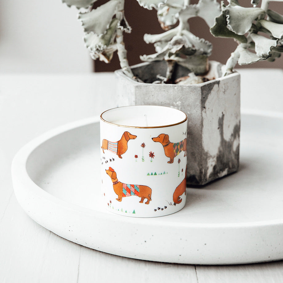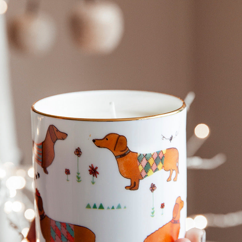 Housed in an elegant fine bone china jar, this candle showcases our popular, hand-painted sausage dog design with an opulent 24-carat gold rim. Perfect for adding a touch of charm to any room, the jar becomes a keepsake once the candle has burned, ideal for storage or display, making it a giftable, sustainable piece you’ll treasure.